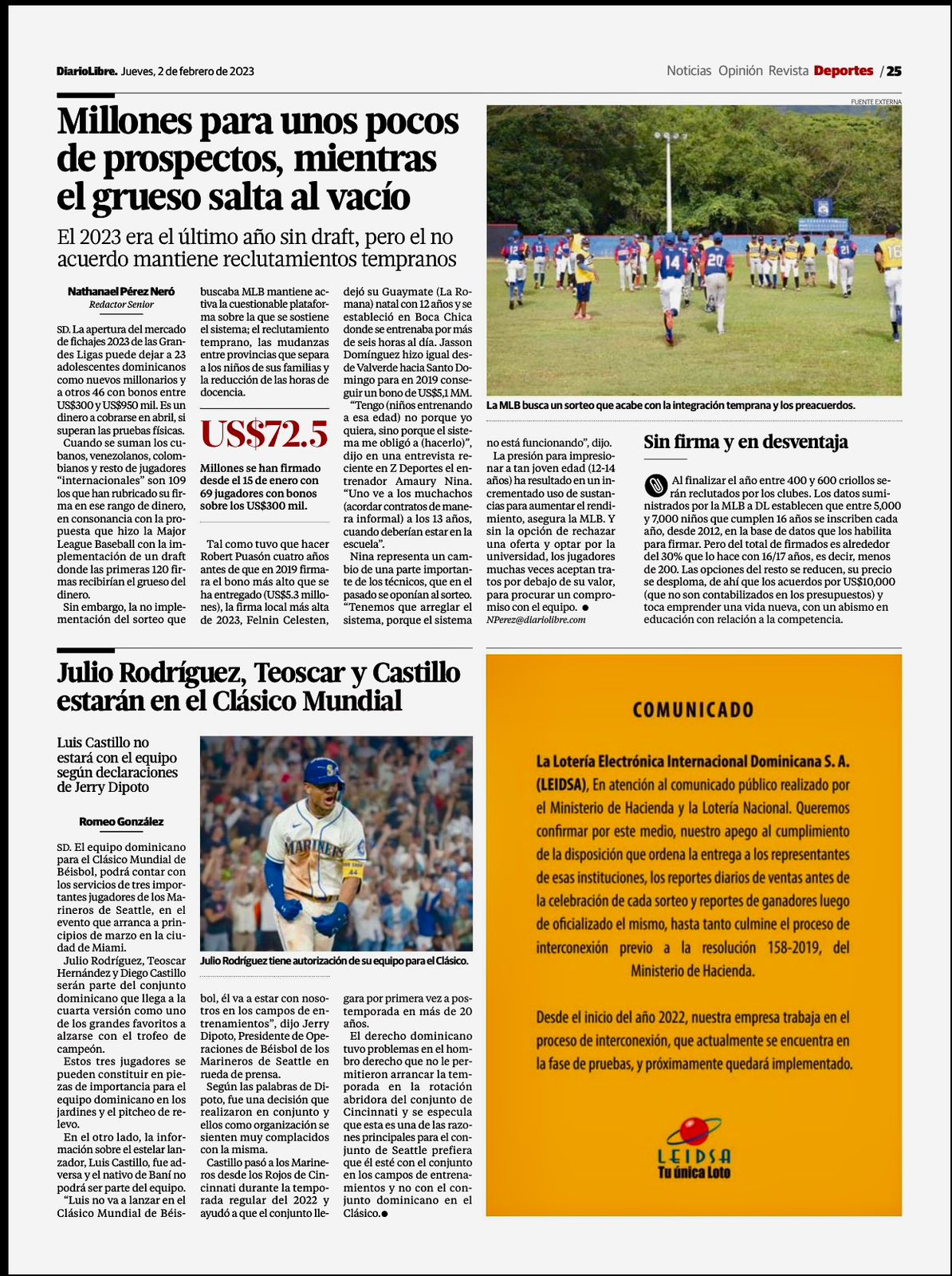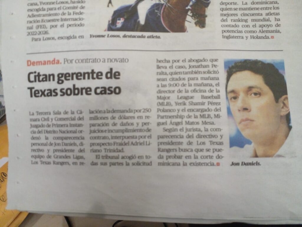 La Tercera Sala de la Cámara Civil y Comercial del Juzgado de Primera Instancia del Distrito Nacional ordenó la comparecencia personal de Jon Daniels, exdirectivo y expresidente del equipo de grandes ligas, los Texas Rangers y actual asesor senior de los Rays de Tampa Bay en relación a la demanda por 250 millones de dólares en reparación de daños y perjuicios e incumplimiento de contrato, interpuesta por el prospecto dominicano Fraidel Adriel Liriano Trinidad. Vía: AN7