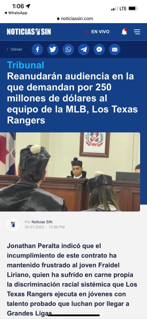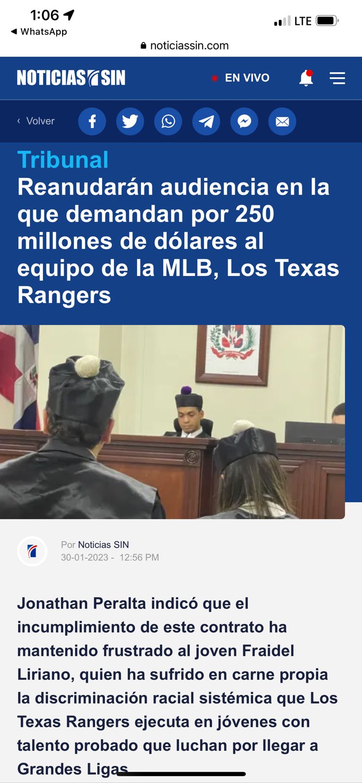 Soy Fraidel Liriano, he sido víctima del equipo de las Grandes Ligas Los Texas Rangers. Quienes Incumplieron su contrato.